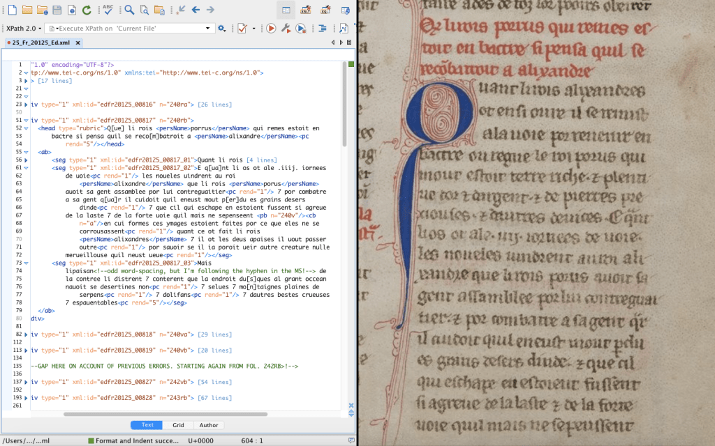 Header image: an extract from the TEI encoding project I’m currently working on as part of the Values of French project at KCL. This, incidentally, is an example of a ‘digitisation-plus’ project, aiming to open up the text in question, the Histoire ancienne jusqu’à César, in new ways by using the power of XML.